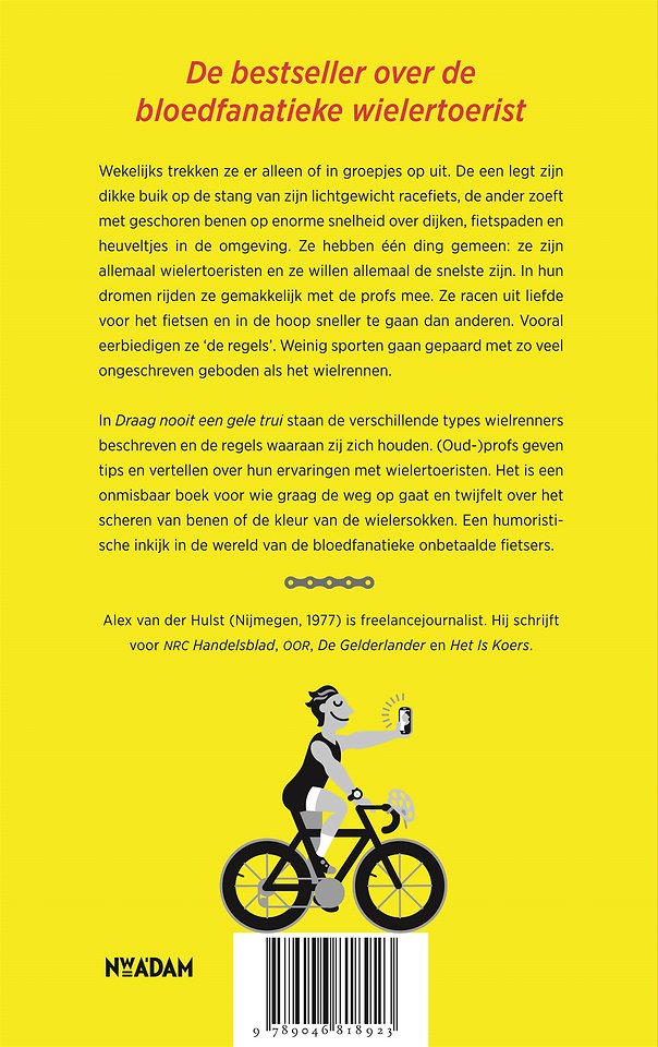 In Draag nooit een gele trui staan de verschillende types wielrenners beschreven en de regels waaraan zij zich houden. (Oud-)profs geven tips en vertellen over hun ervaringen met wielertoeristen. Het is een onmisbaar boek voor wie graag de weg op gaat en twijfelt over het scheren van benen of de kleur van de wielersokken. Een humoristische inkijk in de wereld van de bloedfanatieke onbetaalde fietsers.