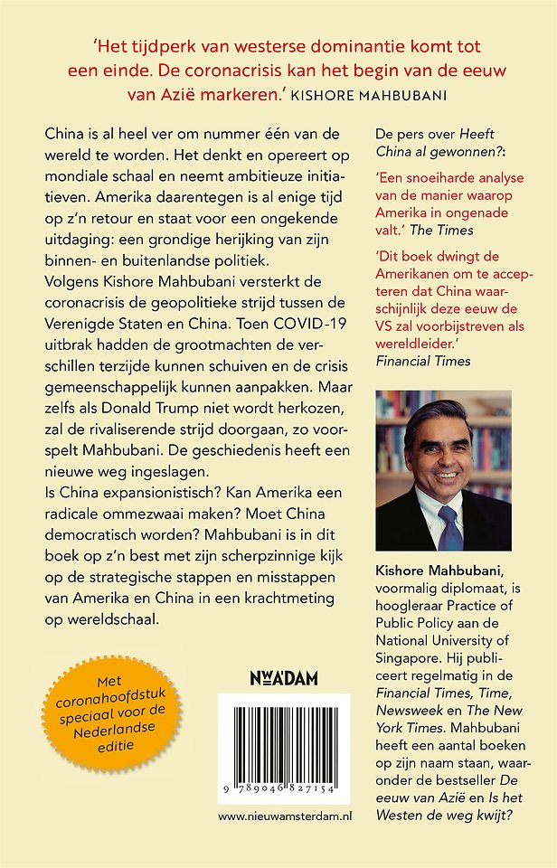 Meer over Kishore MahbubaniChina is al aardig op weg om nummer één van de wereld te worden. Het denkt en opereert op mondiale schaal en neemt ambitieuze initiatieven, onder leiding van een van de meest competente en pragmatische wereldleiders. Amerika daarentegen is al enige tijd op z'n retour en heeft te maken met een economisch model dat door de financiële crisis van 2008 behoorlijk aan kracht heeft ingeboet.