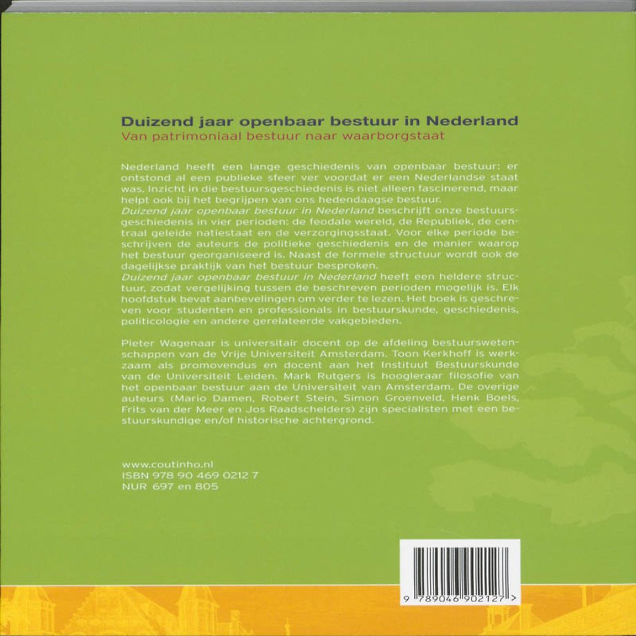 Duizend jaar openbaar bestuur in Nederland beschrijft onze bestuursgeschiedenis in vier perioden: de feodale wereld, de Republiek, de centraal geleide natiestaat en de verzorgingsstaat. Voor elke periode beschrijven de auteurs de politieke geschiedenis en de manier waarop het bestuur georganiseerd is. Naast de formele structuur wordt ook de dagelijkse praktijk van het bestuur besproken.