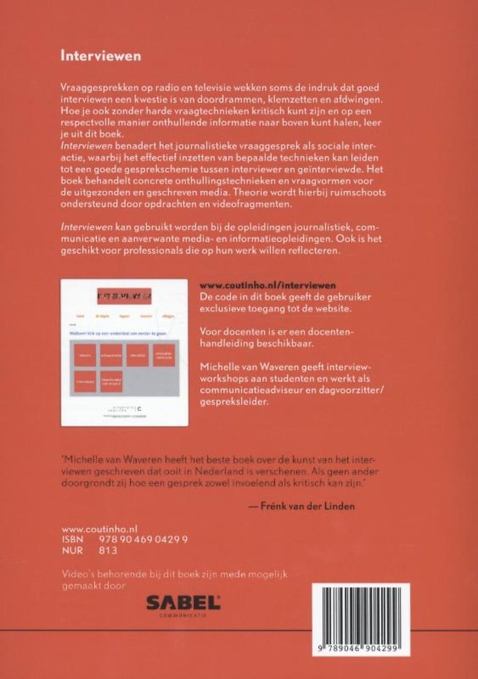 Vraaggesprekken op radio, televisie en in de krant wekken soms de indruk dat goed interviewen een kwestie is van doordrammen, klemzetten en afdwingen. Je kunt echter ook zonder harde vraagtechnieken kritisch zijn. Hoe je op een respectvolle manier onthullende informatie naar boven kunt halen, leer je uit dit boek. In Interviewen wordt het journalistieke vraaggesprek in de eerste plaats benaderd als sociale interactie, waarbij het effectief inzetten van bepaalde technieken kan leiden tot een goede gesprekschemie tussen interviewer en geïnterviewde. Het boek vergelijkt concrete onthullingtechnieken en vraagvormen voor verschillende media als radio, televisie en print.Voor deze herziene druk is op veler verzoek een nieuw hoofdstuk over het uitwerken van het interview geschreven. Ook ligt er meer nadruk op de praktijk: de lezer kan in het boek en op de website actief aan de slag met opdrachten, actuele video's, en discussievragen. Op de website krijgt de lezer een bijzondere blik achter de schermen van het interviewen: in speciaal voor dit boek geproduceerde video's laat de auteur bekende interviewers, onder wie Frénk van der Linden, Mariëlle Tweebeeke en Joris Linssen, op hun eigen werk reflecteren. Met ook nog een checklist om gestructureerd te werken, een methode voor zelfevaluatie en een docentenhandleiding is dit boek een complete leermethode voor interviewen.Interviewen kan gebruikt worden bij de opleidingen journalistiek, communicatie en aanverwante media- en informatieopleidingen. Ook voor professionals die op hun werk willen reflecteren heeft dit boek veel te bieden.Michelle van Waveren geeft interviewworkshops aan studenten en werkt als communicatieadviseur en dagvoorzitter/gespreksleider.