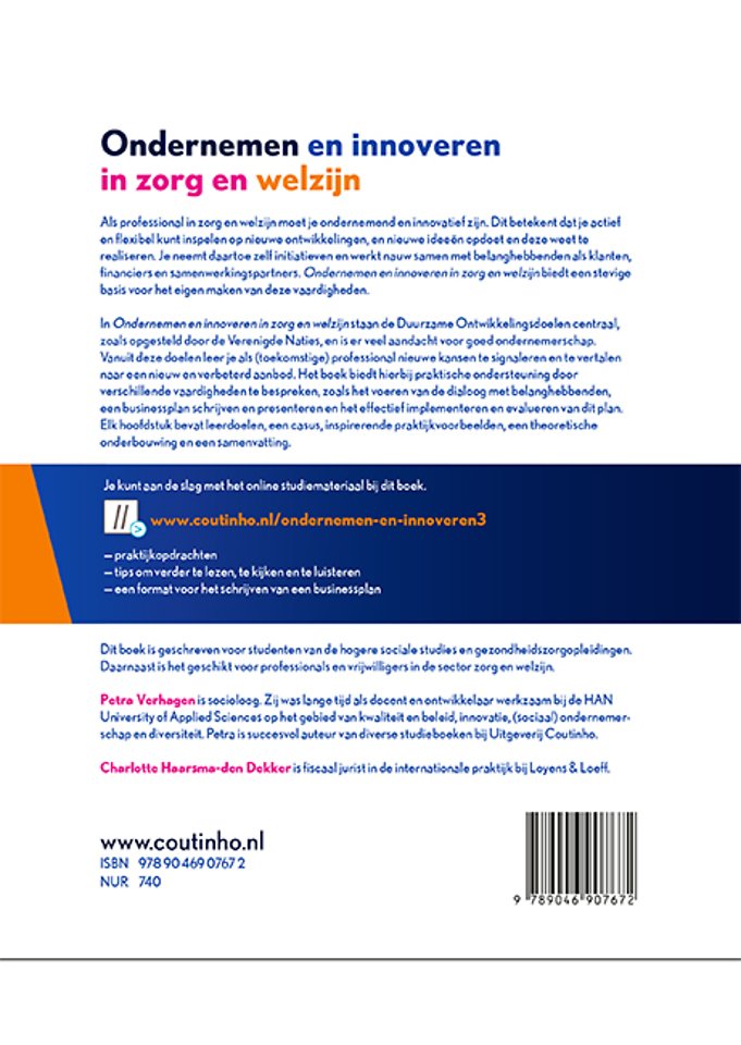 In Ondernemen en innoveren in zorg en welzijn staan de Duurzame Ontwikkelingsdoelen centraal, zoals opgesteld door de Verenigde Naties. Vanuit deze doelen leer je als (toekomstige) professional nieuwe kansen te signaleren, deze te vertalen naar een nieuw en verbeterd aanbod, de dialoog te voeren met de belanghebbenden, een businessplan te schrijven en te presenteren én dit plan effectief te implementeren en evalueren. Elk hoofdstuk bevat leerdoelen, een casus, inspirerende praktijkvoorbeelden, een theoretische onderbouwing en een samenvatting. De ondersteunende website biedt praktijkopdrachten, voorbeelddocumenten en verwijzingen naar diverse interessante bronnen.