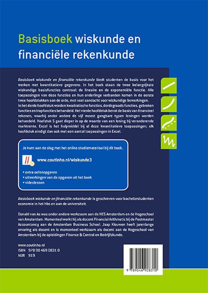 Basisboek wiskunde en financiële rekenkunde biedt studenten de basis voor het werken met kwantitatieve gegevens. In het boek staan de twee belangrijkste wiskundige basisfuncties centraal: de lineaire en de exponentiële functie. Alle toepassingen van deze functies en hun onderlinge verbanden komen in de eerste twee hoofdstukken aan de orde, met veel aandacht voor wiskundige bewerkingen.