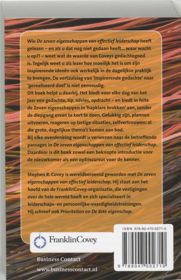 Bij elke overdenking wordt u verwezen naar de betreffende passages in 'De zeven eigenschappen van effectief leiderschap'. Daardoor is dit boek zowel een beknopte introductie voor de nieuwkomer als een opfriscursus voor de kenner.