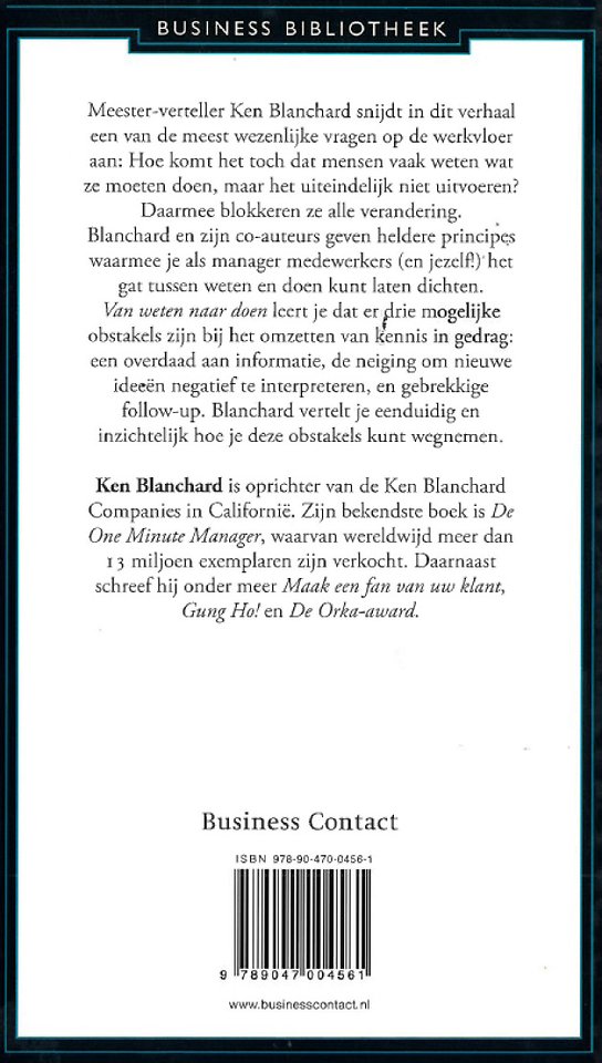 Meer over de auteursMeester-verteller Ken Blanchard snijdt in dit verhaal een van de meest wezenlijke vragen op de werkvloer aan: Hoe komt het toch dat mensen vaak weten wat ze moeten doen, maar het uiteindelijk niet uitvoeren? Daarmee blokkeren ze alle verandering. Blanchard en zijn co-auteurs leggen uit hoe dat komt en geven vervolgens heldere principes waarmee je als manager medewerkers (en jezelf!) het gat tussen weten en doen kunt laten dichten.
