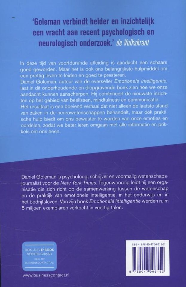 Daniel Goleman, auteur van de everseller 'Emotionele intelligentie', laat in dit onderhoudende en diepgravende boek zien hoe we onze aandacht kunnen aanscherpen. Hij combineert de nieuwste inzichten op het gebied van beslissen, mindfulness en communicatie. Het resultaat is een boeiend verhaal dat niet alleen de laatste stand van zaken in de neurowetenschappen behandelt, maar ook praktische hulp biedt om ons bewuster te worden van onze emoties en oordelen, zodat we beter leren omgaan met alle informatie en prikkels om ons heen.