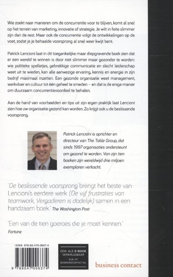 Aan de hand van voorbeelden en tips uit zijn eigen praktijk laat Lencioni zien hoe uw organisatie gezond kan worden. Zo krijgt ook u de beslissende voorsprong.