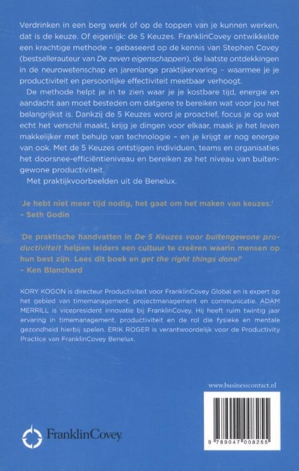 Meer over de auteursVerdrinken in een berg werk of op de toppen van je kunnen werken, dat is de keuze. Of eigenlijk: de 5 Keuzes. FranklinCovey ontwikkelde een krachtige methode – gebaseerd op de kennis van Stephen Covey (bestsellerauteur van 'De zeven eigenschappen'), de laatste ontdekkingen in de neurowetenschap en jarenlange praktijkervaring – waarmee je je productiviteit en persoonlijke effectiviteit meetbaar verhoogt.