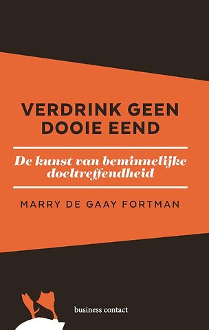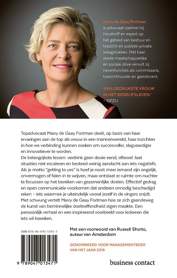 Meer over Marry de Gaay FortmanIn ‘Verdrink geen dooie eend’ deelt topadvocaat Marry de Gaay Fortman, op basis van haar ervaringen aan de top als vrouw in een mannenwereld, haar inzichten in hoe we verbinding kunnen zoeken om succesvoller, slagvaardiger en innovatiever te worden. De belangrijkste lessen: verdrink geen dooie eend, oftewel: laat situaties niet escaleren en besteed weinig aandacht aan iets negatiefs.