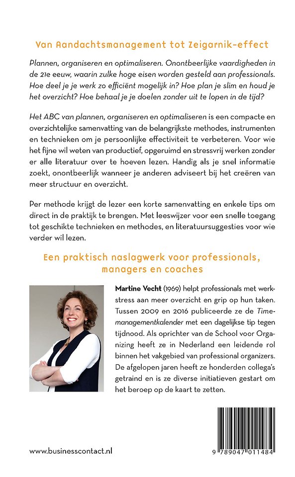 Meer over Martine VechtMartine Vecht biedt met 'Het ABC van plannen, organiseren en optimaliseren' een compacte en overzichtelijke samenvatting van de belangrijkste methodes, instrumenten en technieken om je persoonlijke effectiviteit te verbeteren. Voor wie het fijne wil weten van productief, opgeruimd en stressvrij werken zonder er alle literatuur over te hoeven lezen. Handig als je snel informatie zoekt, onontbeerlijk wanneer je anderen adviseert bij het creëren van meer structuur en overzicht.