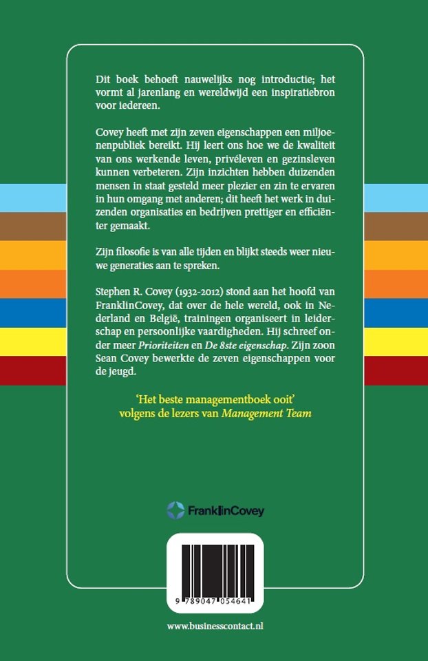 Covey heeft met zijn zeven eigenschappen een miljoenenpubliek bereikt. Hij leert ons hoe we de kwaliteit van ons werkende leven, privé-leven en gezinsleven kunnen verbeteren. Zijn inzichten hebben duizenden mensen in staat gesteld meer plezier en zin te ervaren in hun omgang met anderen; dit heeft het werk in duizenden organisaties en bedrijven prettiger en effectiever gemaakt. Zijn filosofie is van alle tijden en blijkt steeds weer nieuwe generaties aan te spreken. Nu in nieuwe vertaling!