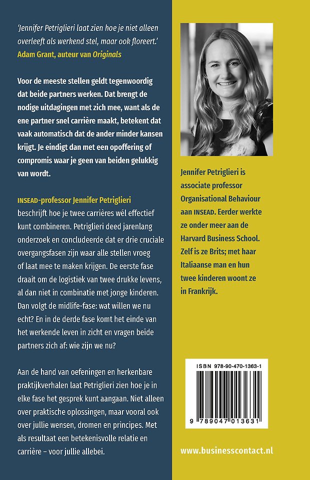 Meer over Jennifer PetriglieriINSEAD-professor Jennifer Petriglieri beschrijft in haar boek 'Jouw carrière, mijn carrière' hoe je twee carrières wél effectief kunt combineren. Voor de meeste stellen geldt tegenwoordig dat beide partners werken. Dat brengt de nodige uitdagingen met zich mee, want als de ene partner snel carrière maakt, betekent dat vaak automatisch dat de ander minder kansen krijgt. Je eindigt dan met een opoffering of compromis waar je geen van beiden gelukkig van wordt.