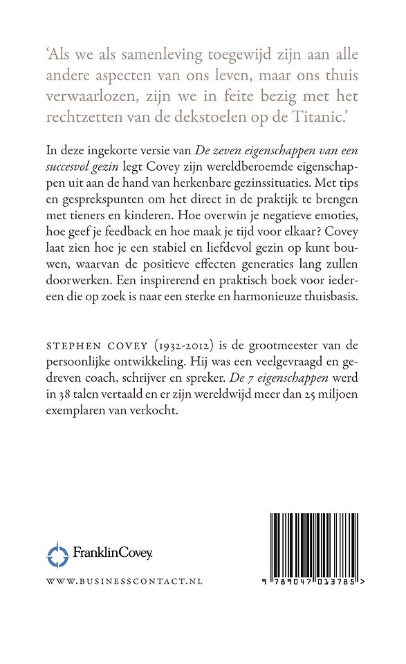 Meer over Stephen CoveyIn deze ingekorte versie van ‘De zeven eigenschappen van een succesvol gezin’ legt Stephen Covey zijn wereldberoemde eigenschappen uit aan de hand van herkenbare gezinssituaties. Met tips en gesprekspunten om het direct in de praktijk te brengen met tieners en kinderen.