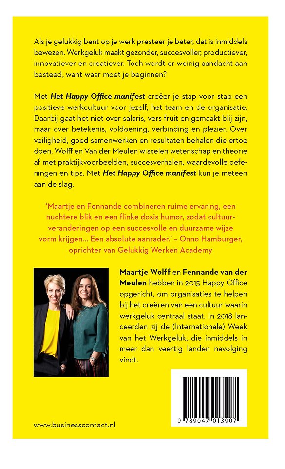‘Het Happy Office Manifest’ van Maartje Wolff en Fennande van der Meulen is het meest complete en praktische boek over werkgeluk dat er is. Het is inmiddels bewezen dat werkgeluk gezonder, succesvoller, productiever, innovatiever én creatiever maakt. Toch wordt er maar weinig aandacht aan besteed.
