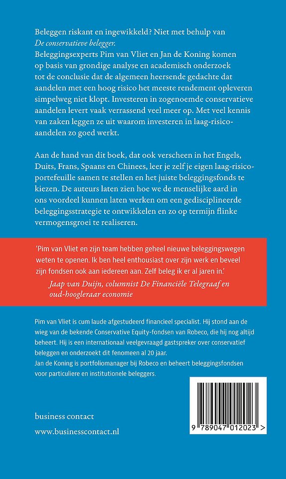 Met behulp van ‘De conservatieve belegger’ van beleggingsexperts Pim van Vliet en Jan de Koning is beleggen niet langer riskant en ingewikkeld. Van Vliet en De Koning komen op basis van grondige analyse en academisch onderzoek tot de conclusie dat de algemeen heersende gedachte dat aandelen met een hoog risico het meeste rendement opleveren simpelweg niet klopt. Investeren in zogenoemde conservatieve aandelen levert vaak verrassend veel meer op. Met veel kennis van zaken leggen ze uit waarom investeren in laag-risicoaandelen zo goed werkt.