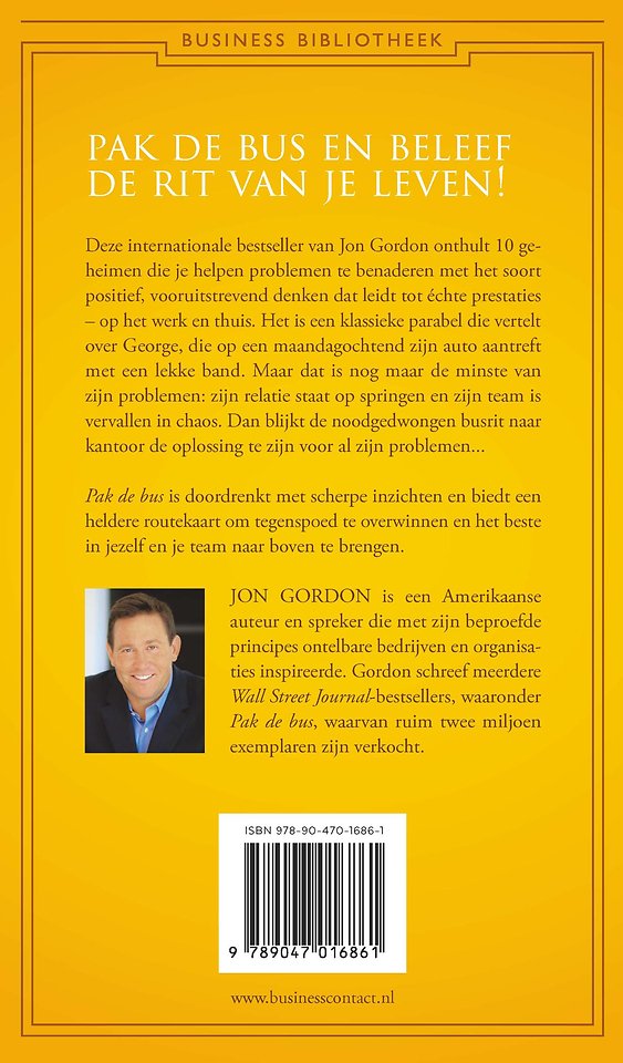 Meer over Jon Gordon'Pak de bus' van Jon Gordon onthult 10 geheimen die je helpen problemen te benaderen met het soort positief, vooruitstrevend denken dat leidt tot échte prestaties – op het werk en thuis. Het is een klassieke parabel die vertelt over George, die op een maandagochtend zijn auto aantreft met een lekke band.