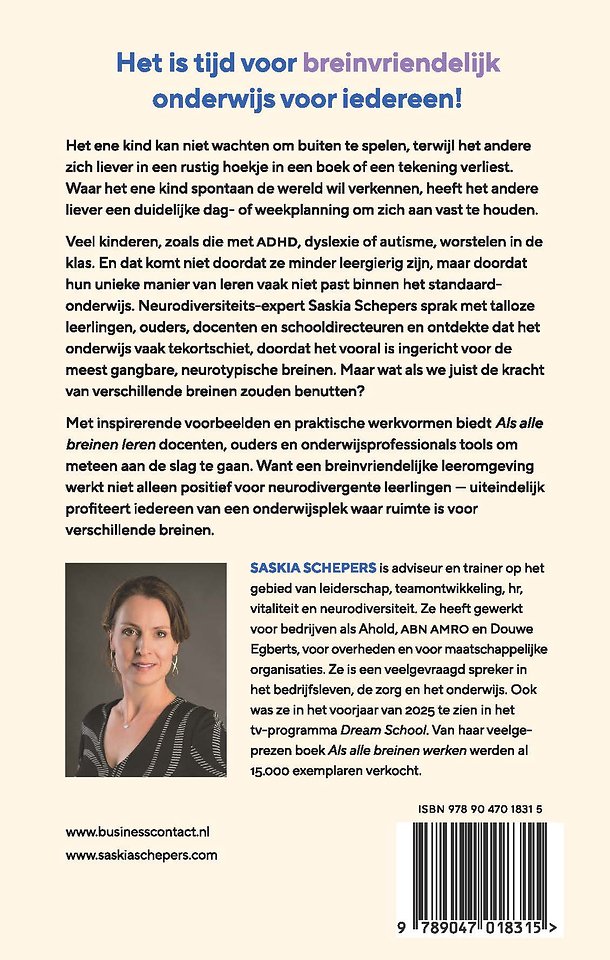 Meer over Saskia SchepersHet is tijd voor breinvriendelijker onderwijs! Met 'Als alle breinen werken' gaf Saskia Schepers al duizenden werknemers en leidinggevenden de sleutel tot meer ruimte voor neurodiversiteit op het werk. Maar dit begint al veel eerder: op school.