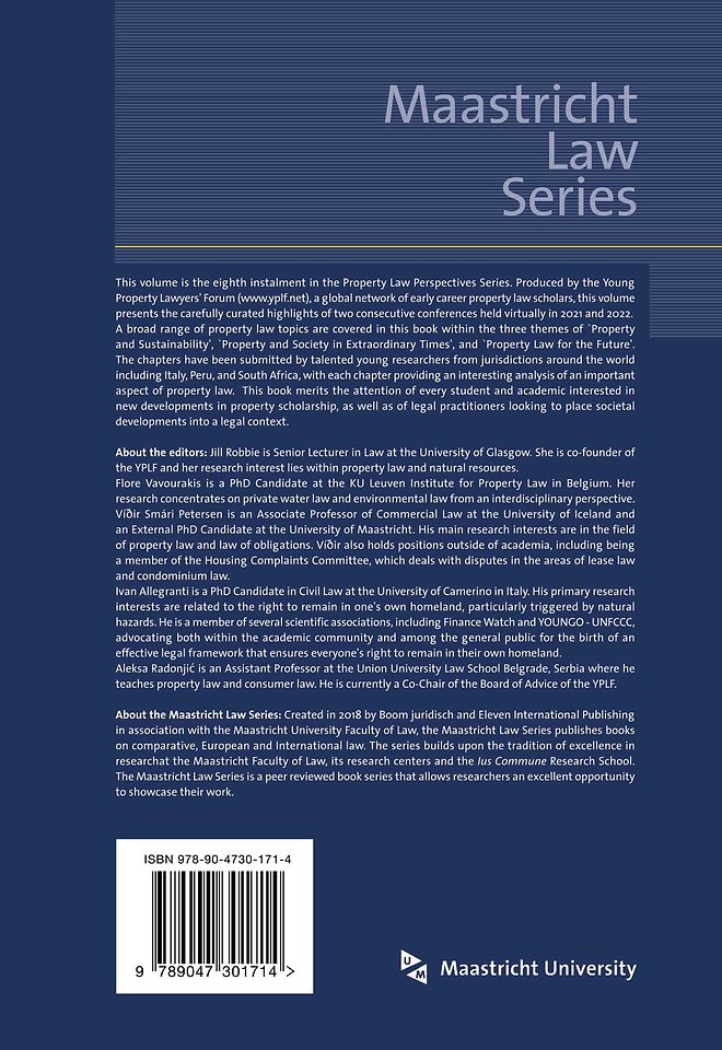 This volume is the eighth instalment in the Property Law Perspectives Series. Produced by the Young Property Lawyers' Forum (www.yplf.net), a global network of early career property law scholars, this volume presents the carefully curated highlights of two consecutive conferences held virtually in 2021 and 2022.