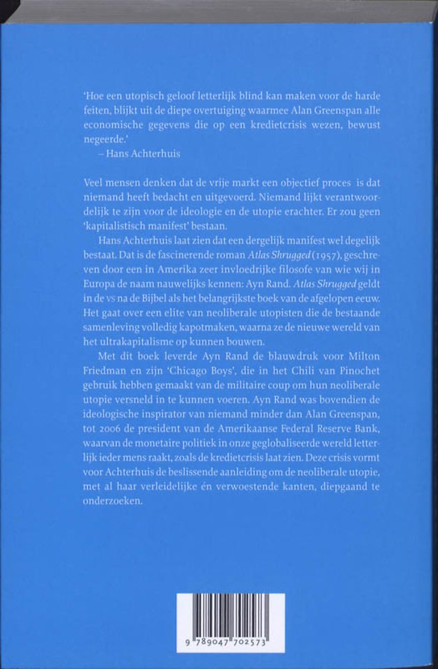 Met dit boek leverde Ayn Rand de blauwdruk voor Milton Friedman en zijn 'Chicago Boys', die in het Chili van Pinochet gebruik hebben gemaakt van de militaire coup om hun neoliberale utopie versneld in te kunnen voeren. Ayn Rand was bovendien de ideo logische inspirator van niemand minder dan Alan Greenspan, tot 2006 de president van de Amerikaanse Federal Reserve Bank, waarvan de monetaire politiek in onze geglobaliseerde wereld letterlijk ieder mens raakt, zoals de kredietcrisis laat zien. Deze crisis vormt voor Achterhuis de beslissende aanleiding om de neoliberale utopie, met al haar verleidelijke én verwoestende kanten, diepgaand te onderzoeken.