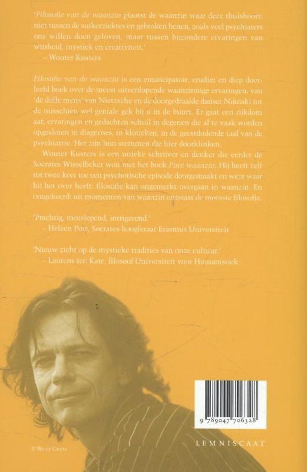 Wouter Kusters schreef een erudiet en diep doorleefd boek over de meest uiteenlopende waanzinnige ervaringen: van 'de dolle mens' van Nietzsche en de doorgedraaide danser Nijinski tot de misschien wel geniale gek bij u in de buurt. Daarbij plaatst hij de waanzin in een uitzonderlijk breed perspectief. Hij beschrijft tal van hoogtepunten in onze cultuur die frappante overeenkomsten vertonen met uitingen van waanzinnigen: filosofie van Plotinus en Sloterdijk, mystiek van Meister Eckhart, literatuur van Aldous Huxley, kunst van M.C. Escher, muziek van The Doors, films als The Truman Show en The Matrix.