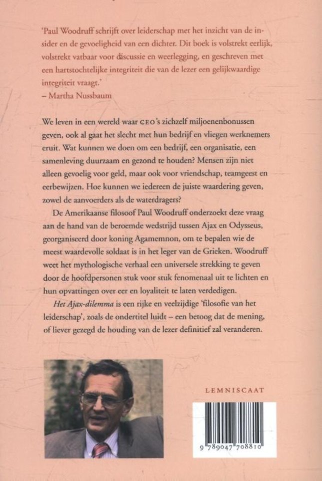'Paul Woodruff schrijft over leiderschap met het inzicht van de insider en de gevoeligheid van een dichter. Dit boek is volstrekt eerlijk, volstrekt vatbaar voor discussie en weerlegging, en geschreven met een hartstochtelijke integriteit die van de lezer een gelijkwaardige integriteit vraagt.' - Martha Nussbaum