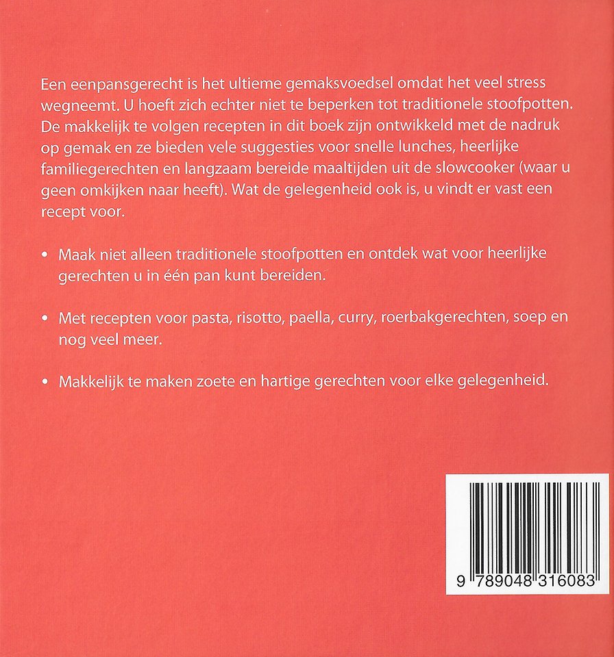 Een eenpansgerecht is het ultieme gemaksvoedsel omdat het veel stress wegneemt. U hoeft zich echter niet te beperken tot traditionele stoofpotten. De makkelijk te volgen recepten in dit boek zijn ontwikkeld met de nadruk op gemak en ze bieden vele suggesties voor snelle lunches, heerlijke familiegerechten en langzaam bereide maaltijden uit de slowcooker (waar u geen omkijken naar heeft). Wat de gelegenheid ook is, u vindt er vast een recept voor.