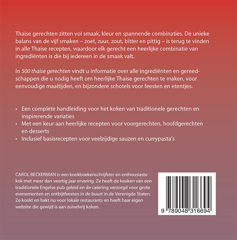 Net als de hoofdstad Bangkok, is eten uit Thailand heet, kleurrijk, pittig en uniek. Het land staat bekend om zijn geschiedenis en zijn keuken, en Bangkok ontvangt jaarlijks meer toeristen dan Londen, Parijs en New York. Het geheim van de Thaise keuken zit hem in de perfecte balans tussen zoet, zuur, zout, bitter en gekruid. Met de 500 gerechten in dit boek wordt ook u een expert in de Thaise keuken.