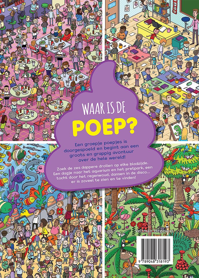 prentenboek zoekboek kinderboek humor avontuur toilethumor wereldreis ontdekken visuele prikkeling interactief lezen personificatie plezier fantasie reizen speels locatie activiteiten jonge kinderen pretpark regenwoud disco aquarium visuele concentratie dagelijkse activiteiten illustraties verbeelding voorlezen