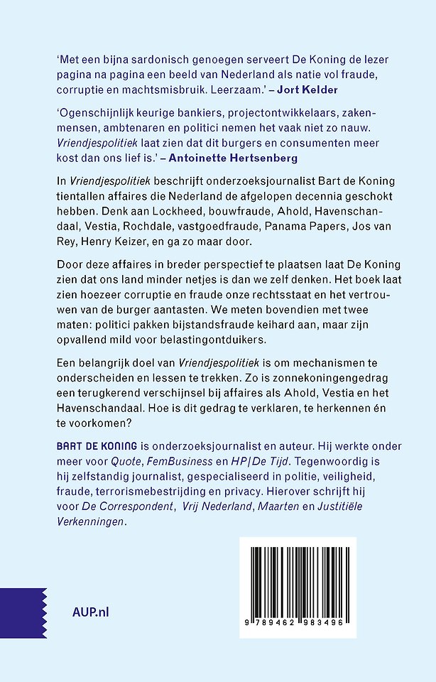 In Vriendjespolitiek laat gerenommeerd onderzoeksjournalist Bart de Koning zien dat ons land minder netjes is dan we denken of geloven - tegen beter weten in. Want hoe vaak zijn we er niet getuige van geweest dat Nederland geschokt werd door een affaire? De Koning plaatst de vele Nederlandse affaires van de afgelopen decennia in een breder perspectief en verklaart hoe ze ontstaan en waarom er steeds weer nieuwe affaires opduiken.