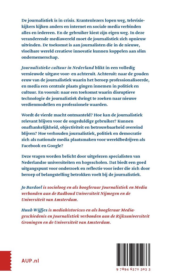 'Journalistieke cultuur in Nederland' blikt in een volledig vernieuwde uitgave voor- en achteruit. Achteruit: naar de gouden eeuw van de journalistiek waarin het beroep professionaliseerde, en media een centrale plaats gingen innemen in politiek en cultuur. En vooruit: naar een toekomst waarin disruptieve technologie de journalistiek dwingt te zoeken naar nieuwe verdienmodellen en professionele waarden.