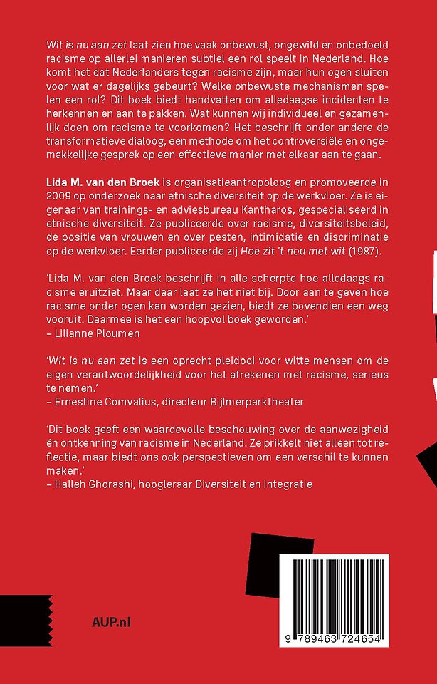 'Wit is nu aan zet' laat zien hoe vaak onbewust, ongewild en onbedoeld racisme op allerlei manieren subtiel een rol spelen in Nederland. Hoe komt het dat Nederlanders tegen racisme zijn, maar hun ogen sluiten voor wat er dagelijks gebeurt? Welke onbewuste mechanismen spelen een rol? Dit boek biedt handvatten om alledaagse incidenten te herkennen en aan te pakken. Wat kunnen wij individueel en gezamenlijk doen om racisme te voorkomen? Het beschrijft onder andere de transformatieve dialoog, een methode om het controversiële en ongemakkelijke gesprek op een effectieve manier met elkaar aan te gaan.