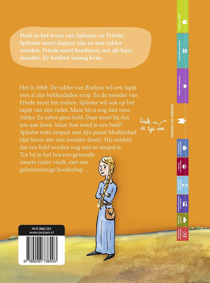 Het is 1068. De ridder van Boeljon wil een tapijt voor aan de muur van zijn kasteel. Met al zijn heldendaden erop. De moeder van Friede moet dit tapijt maken. Splinter, de zoon van de ridder, wil er ook op, maar hij is nog niet eens ridder. En zeker geen held.