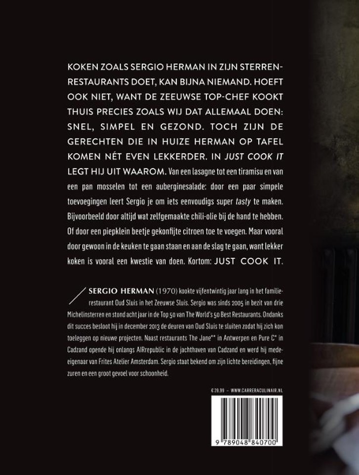 Koken zoals Sergio Herman in zijn sterrenrestaurants doet, kan bijna niemand. Hoeft ook niet, want de Zeeuwse top-chef kookt thuis precies zoals wij dat allemaal doen: snel, simpel en gezond. Toch zijn de gerechten die in huize Herman op tafel komen nét even lekkerder. In Just Cook It legt hij uit waarom. Van een lasagne tot een tiramisu en van een pan mosselen tot een auberginesalade: door een paar simpele toevoegingen leert Sergio je om iets eenvoudigs super tasty te maken. Bijvoorbeeld door altijd wat zelfgemaakte chili-olie bij de hand te hebben. Of door een piepklein beetje gekonfijte citroen toe te voegen. Maar vooral door gewoon in de keuken te gaan staan en aan de slag te gaan, want lekker koken is vooral een kwestie van doen. Kortom: JUST COOK IT.