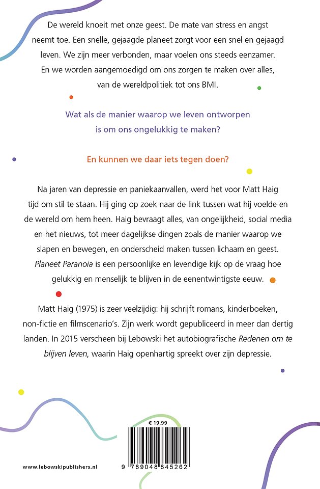 Na jaren van depressie en paniekaanvallen, werd het voor Matt Haig tijd om stil te staan. Hij ging op zoek naar de link tussen wat hij voelde en de wereld om hem heen. Haig bevraagt alles, van ongelijkheid, social media en het nieuws, tot meer dagelijkse dingen zoals de manier waarop we slapen en bewegen, en onderscheid maken tussen lichaam en geest.