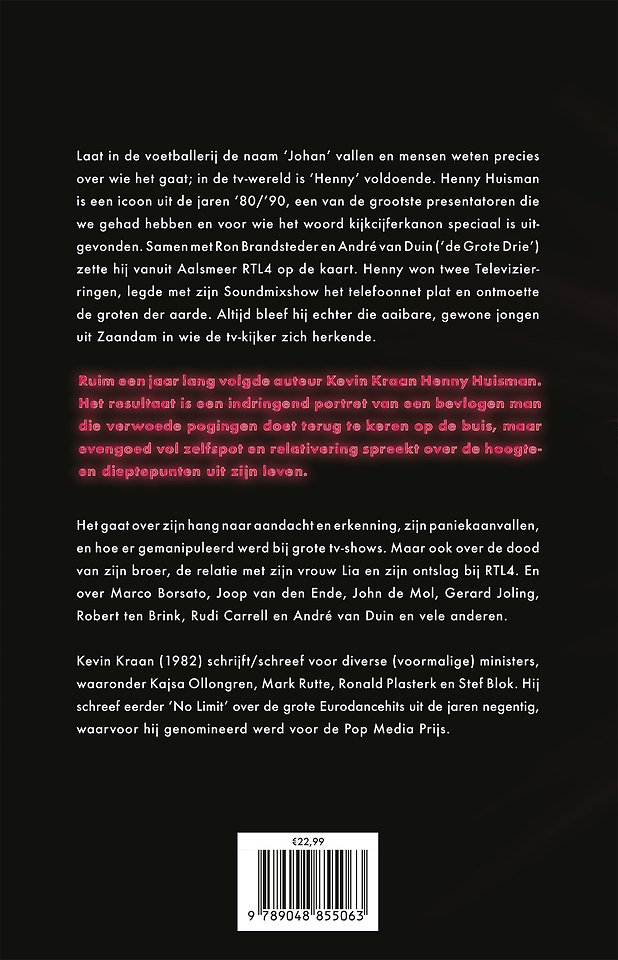 Laat in de voetballerij de naam 'Johan' vallen en mensen weten precies over wie het gaat; in de tv-wereld is 'Henny' voldoende. Henny Huisman is een icoon uit de jaren '80/'90, een van de grootste presentatoren die we gehad hebben en voor wie het woord kijkcijferkanon speciaal is uitgevonden. Samen met Ron Brandsteder en André van Duin ('de Grote Drie') zette hij vanuit Aalsmeer RTL4 op de kaart. Henny won twee Televizierringen, legde met zijn Soundmixshow het telefoonnet plat en ontmoette de groten der aarde. Altijd bleef hij echter die aaibare, gewone jongen uit Zaandam in wie de tv-kijker zich herkende.