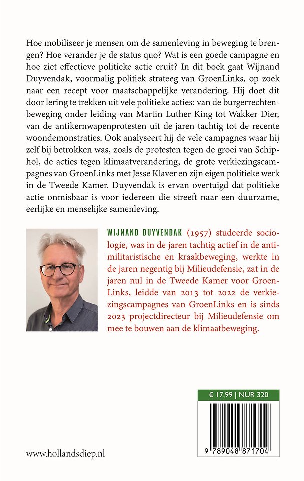 Hoe mobiliseer je mensen om de samenleving in beweging te brengen? Hoe verander je de status quo? Wat is een goede campagne en hoe ziet effectieve politieke actie eruit? In dit boek gaat Wijnand Duyvendak, voormalig politiek strateeg van GroenLinks, op zoek naar een recept voor maatschappelijke verandering.