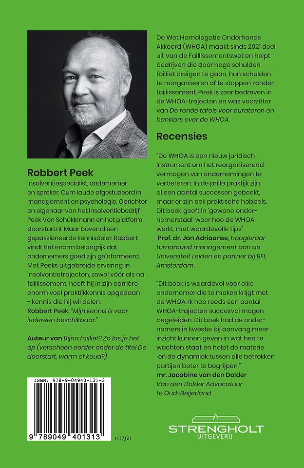 Dit boek is waardevol voor elke ondernemer die te maken krijgt met de WHOA. Ik heb reeds een aantal WHOA-trajecten succesvol mogen begeleiden. Dit boek had de ondernemers in kwestie bij aanvang meer inzicht kunnen geven in wat hen te wachten staat en helpt de materie en de dynamiek tussen alle betrokken partijen beter te begrijpen. - mr. Jacobine van den Dolder Van den Dolder Advocatuur te Oud-Beijerland