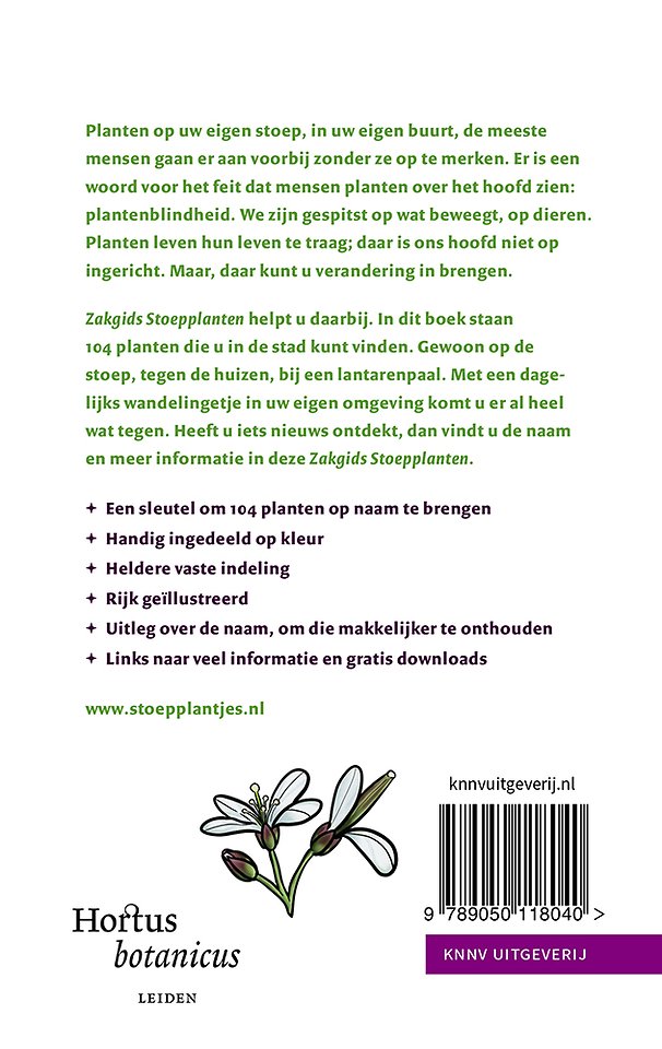 In deze plantengids staan 104 planten die je in de stad kunt vinden. Gewoon op de stoep, tegen de huizen, bij een lantarenpaal. Met een dagelijks wandelingetje in je eigen omgeving kom je er al heel wat tegen. Heb je iets nieuws ontdekt, dan vind je de naam en meer informatie in deze Zakgids Stoepplanten.