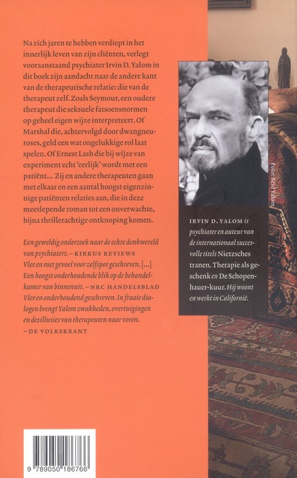 Na zich jarenlang te hebben verdiept in het innerlijk leven van zijn cliënten, verlegt vooraanstaand psychiater Irvin D. Yalom in zijn roman De therapeut zijn aandacht naar de andere kant van de therapeutische relatie: die van de therapeut zelf. Zoals Seymour, een al wat oudere therapeut die seksuele fatsoensnormen op geheel eigen wijze interpreteert. Of Marshal die, achtervolgd door dwangneuroses, geld een wat ongelukkige rol laat spelen. Of Ernest Lash die bij wijze van experiment echt `eerlijk wordt met een patiënt Zij en andere therapeuten gaan met elkaar en een aantal hoogst eigenzinnige patiënten relaties aan die in deze meeslepende roman tot een onverwachte, bijna thrillerachtige ontknoping komen.