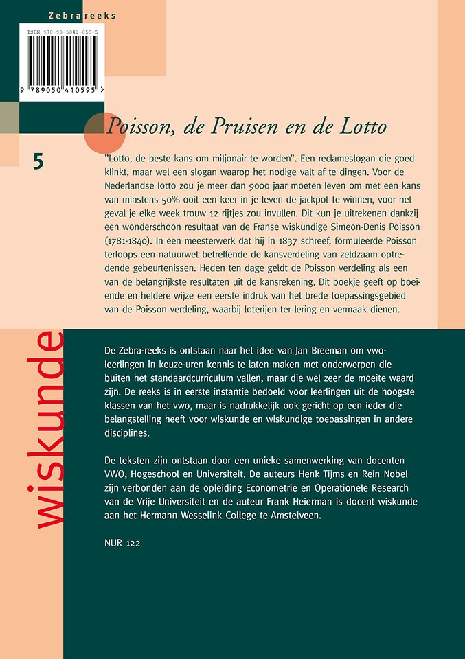 In een meesterwerk dat hij 1837 schreef, formuleerde Poisson terloops een natuurwet betreffende de kansverdeling van zeldzaam optredende gebeurtenissen. Heden ten dage geldt de Poisson verdeling als een van de belangrijkste resultaten uit de kansrekening. Dit boekje geeft op boeiende en heldere wijze een eerste indruk van het brede toepassingsgebied van de Poisson verdeling, waarbij loterijen ter lering en vermaak dienen.