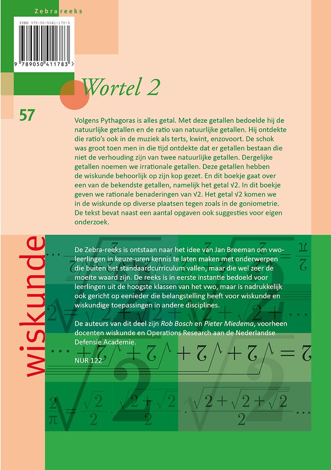 Volgens Pythagoras is alles getal. Met deze getallen bedoelde hij de natuurlijke getallen en de ratio van natuurlijke getallen. Hij ontdekte die ratio’s ook in de muziek als terts, kwint, enzovoort. De schok was groot toen men in die tijd ontdekte dat er getallen bestaan die niet de verhouding zijn van twee natuurlijke getallen. Dergelijke getallen noemen we irrationale getallen. Deze getallen hebben de wiskunde behoorlijk op zijn kop gezet. En dit boekje gaat over een van de bekendste irrationale getallen, namelijk het getal √2. We geven rationale benaderingen van √2. Het getal √2 komen we in de wiskunde op diverse plaatsen tegen zoals in de goniometrie. De tekst bevat naast een aantal opgaven ook suggesties voor eigen onderzoek.