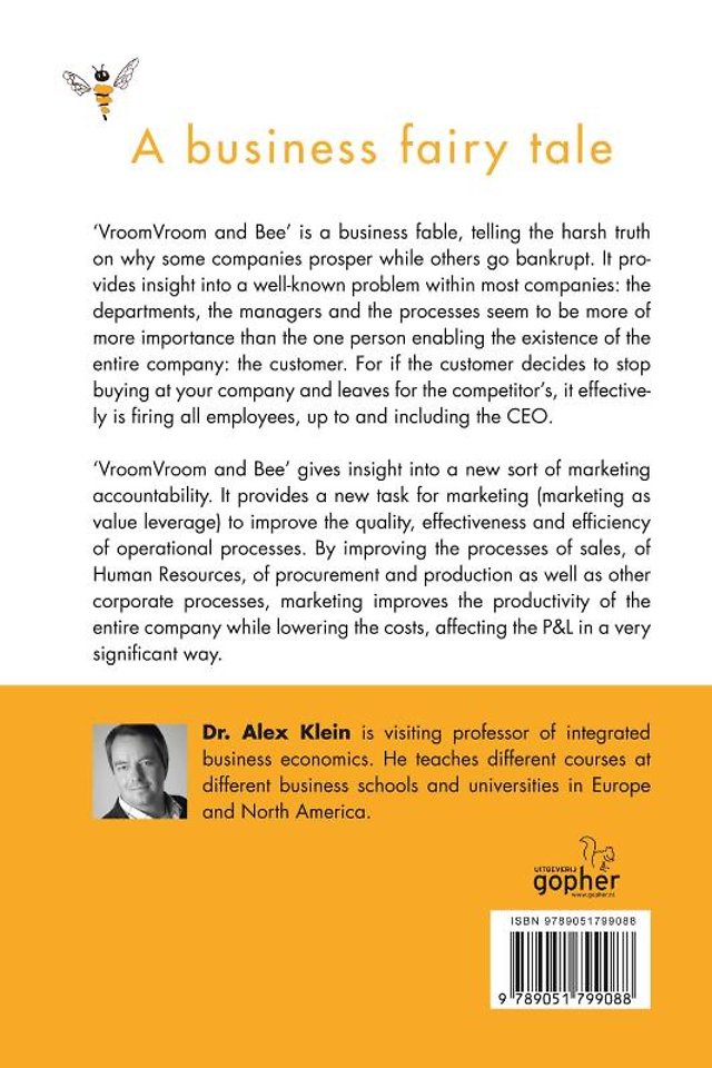 VroomVroom and Bee is a business fable, telling the harsh truth on why some companies prosper while others go bankrupt. It provides insight into a well-known problem within most companies: the departments, the managers and the processes seem to be more of more importance than the one person enabling the existence of the entire company: the customer. For if the customer decides to stop buying at your company and leaves for the competitor's, it effectively is firing all employees, up to and including the CEO.