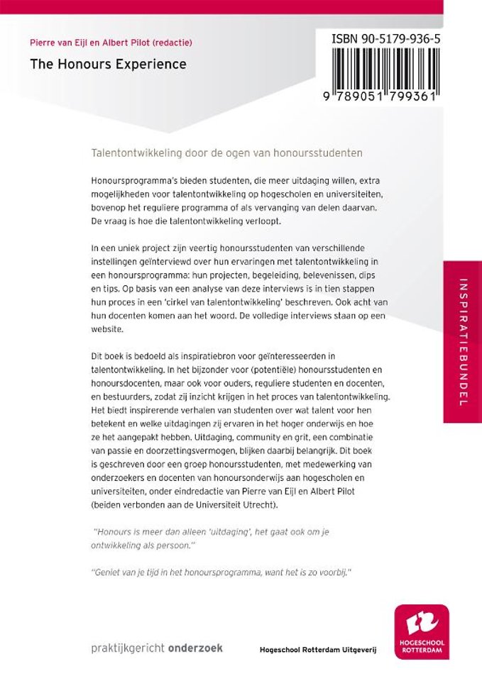 betekent en welke uitdagingen zij ervaren in het hoger onderwijs en hoe ze het aangepakt hebben. Uitdaging, community en grit, een combinatie van passie en doorzettingsvermogen, blijken daarbij belangrijk. Dit boek is geschreven door een groep honoursstudenten, met medewerking van onderzoekers en docenten van honoursonderwijs aan hogescholen en universiteiten, onder eindredactie van Pierre van Eijl en Albert Pilot (beiden verbonden aan de Universiteit Utrecht).