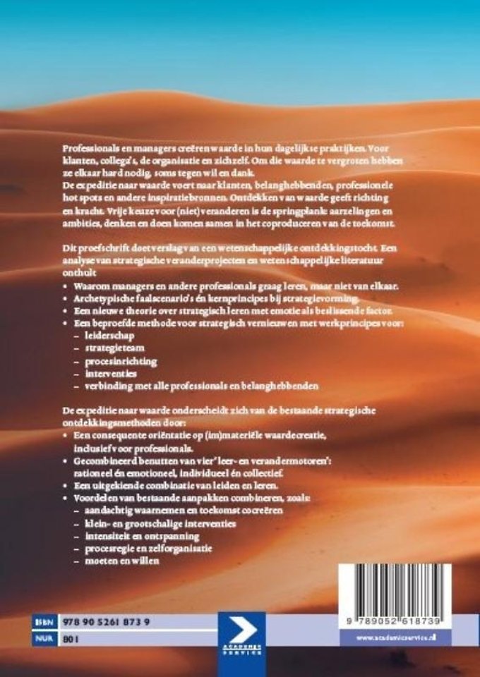 Professionals en managers creëren waarde in hun dagelijkse praktijken. Voor klanten, collega's, de organisatie en zichzelf. Om die waarde te vergroten hebben ze elkaar hard nodig, soms tegen wil en dank. De expeditie naar waarde voert naar klanten, belanghebbenden, professionele hot spots en andere inspiratiebronnen. Ontdekken van waarde geeft richting en kracht. Vrije keuze voor (niet) veranderen is de springplank: aarzelingen en ambities, denken en doen komen samen in het coproduceren van de toekomst.