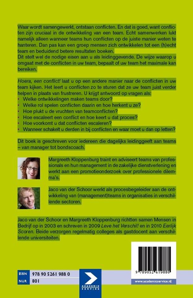 Managers benutten onvoldoende de kracht van conflicten in hun teams. Ze gaan ze uit de weg of raken juist betrokken. Dat terwijl conflicten zo nuttig kunnen zijn en teams verder kunnen helpen in hun ontwikkeling. 'Hoera, een conflict' laat zien dat teams conflicten nodig hebben om succesvol te zijn. De manager speelt hierbij een belangrijke rol. Margreeth Kloppenburg en Jaco van der Schoor willen met 'Hoera, een conflict' bereiken, dat u zich zorgen gaat maken wanneer teamconflicten uitblijven.