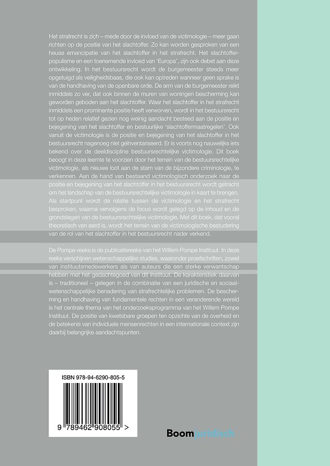 De arm van de burgemeester reikt inmiddels zo ver, dat ook binnen de muren van woningen bescherming kan geworden geboden aan het slachtoffer. Waar het slachtoffer in het strafrecht inmiddels een prominente positie heeft verworven, wordt in het bestuursrecht tot op heden relatief gezien nog weinig aandacht besteed aan de positie en bejegening van het slachtoffer en bestuurlijke ‘slachtoffermaatregelen’. Ook vanuit de victimologie is de positie en bejegening van het slachtoffer in het bestuursrecht nagenoeg niet geïnventariseerd. Er is voorts nog nauwelijks iets bekend over de deeldiscipline bestuursrechtelijke victimologie. Dit boek beoogt in deze leemte te voorzien door het terrein van de bestuursrechtelijke victimologie, als nieuwe loot aan de stam van de bijzondere criminologie, te verkennen.