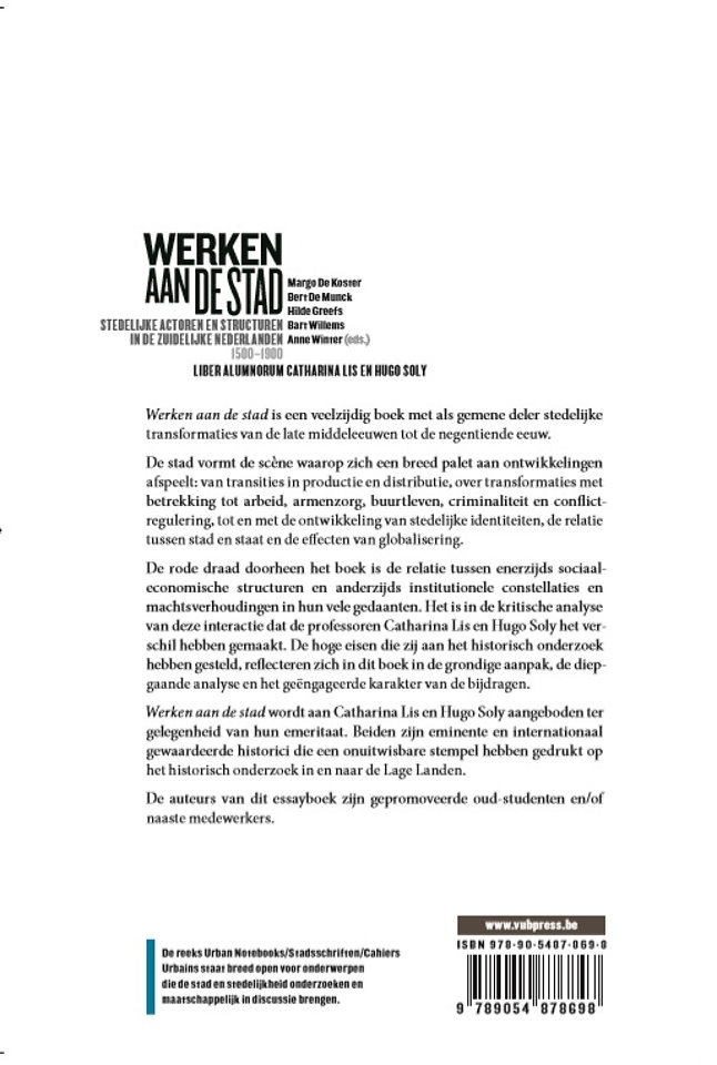 Werken aan de stad wordt aan Catharina Lis en Hugo Soly aangeboden ter gelegenheid van hun emeritaat. Beiden zijn eminente en internationaal gewaardeerde historici die een onuitwisbare stempel hebben gedrukt op het historisch onderzoek in en naar de Lage Landen.