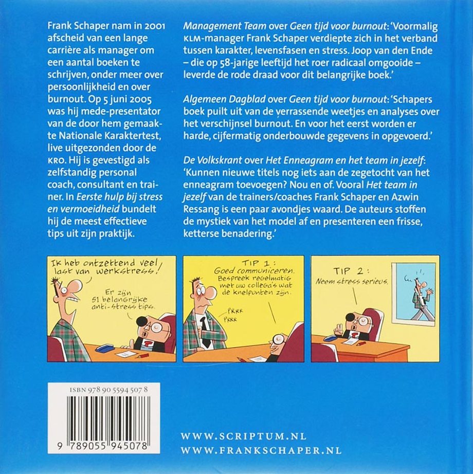 Mensen die deze en andere waarschuwingssginalen van een – mogelijke – burnout ervaren, kunnen baat hebben bij 'Eerste Hulp bij Stress en Vermoeidheid', waarin Frank Schaper aan de hand van een Burnout Top-50 51 tips geeft om burnout te voorkomen.