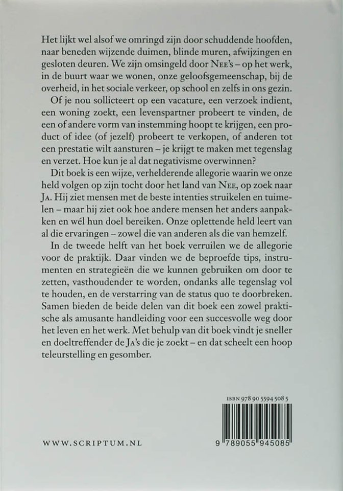 In de tweede helft van het boek verruilen we de allegorie voor de praktijk. Daar vinden we de beproefde tips, instrumenten en strategieën die we kunnen gebruiken om door te zetten, vasthoudender te worden, ondanks alle tegenslag vol te houden en de verstarring van de status quo te doorbreken. Samen bieden de beide delen van dit boek een zowel praktische als amusante handleiding voor een succesvolle weg door het leven en het werk. Met behulp van dit boek vind je sneller en doeltreffender de Ja's die je zoekt en dat scheelt een hoop teleurstelling en gesomber.
