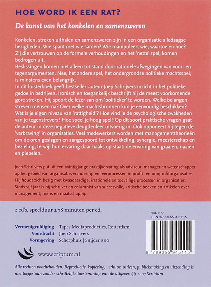 Konkelen, streken uithalen en samenzweren zijn in een organisatie alledaagse bezigheden. Wie spant met wie samen? Wie manipuleert wie, waartoe en hoe? Zij die vertrouwen op de formele verhoudingen en het 'nette' spel, komen bedrogen uit. Beslissingen komen niet alleen tot stand door rationele afwegingen van voor- en tegenargumenten. Nee, het andere spel, het ondergrondse politieke machtsspel, is minstens even belangrijk. In dit luisterboek geeft bestsellerauteur Joep Schrijvers inzicht in het politieke gedoe in bedrijven. Ironisch en toegankelijk beschrijft hij de meest voorkomende gore streken. Hij spoort de lezer aan om 'politieker' te worden. Welke belangen streven mensen na? Over welke machtsbronnen kunt u eenvoudig beschikken? Wat is uw eigen niveau van 'rattigheid'? Hoe vindt u de psychologische zwakheden van uw tegenstrevers? Hoe speelt u hoog spel? Op dit soort praktische vragen gaat de auteur in deze negatieve deugdenleer uitvoerig in. Ook opponeert hij tegen de 'verbraving' in organisaties. Veel medewerkers worden met managementtheorieën om de oren geslagen en aangespoord tot ontwikkeling, synergie, meesterschap en bezieling, terwijl hun ervaring daar haaks op staat: de ervaring van graaien, naaien en piepelen. 2 cd's, speelduur ± 78 minuten per cd.