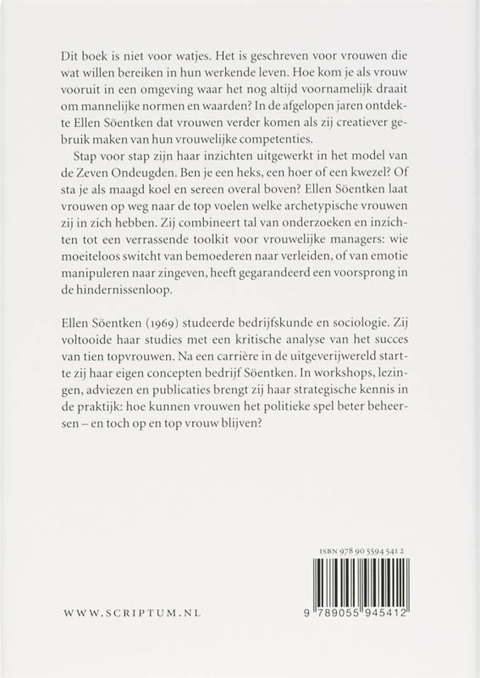 Stap voor stap zijn haar inzichten uitgewerkt in het model van de Zeven Ondeugden. Bent u een heks, een hoer of een kwezel? Of staat u als maagd koel en sereen overal boven? Ellen Söentken laat vrouwen op weg naar de top voelen welke archetypische vrouwen zij in zich hebben. Zij combineert tal van onderzoeken en inzichten tot een verrassende toolkit voor vrouwelijke managers: wie moeiteloos switcht van bemoederen naar verleiden, of van emotie manipuleren naar zingeven, heeft gegarandeerd een voorsprong in de hindernissenloop.